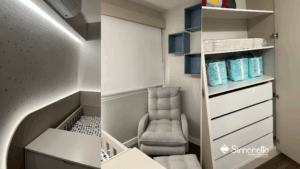 Um ambiente suave, pensado para acolher os primeiros meses do bebê. O berço com iluminação em LED embutida proporciona um clima tranquilo para as noites, enquanto o armário com gaveteiros sem puxadores mantém uma estética minimalista.