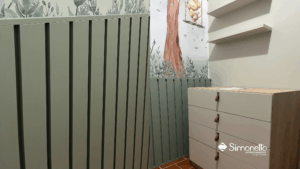 Neste projeto, o encanto vem da atmosfera lúdica inspirada na floresta. Revestimento ripado em meia altura com papel de parede ilustrado com animais criam um cenário delicado e acolhedor.